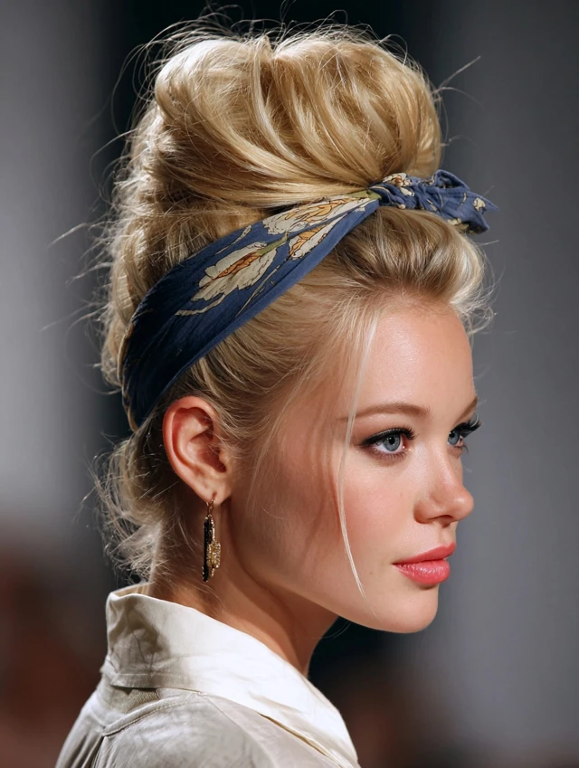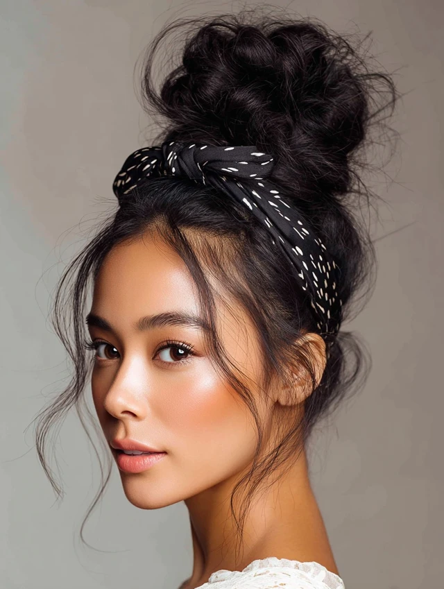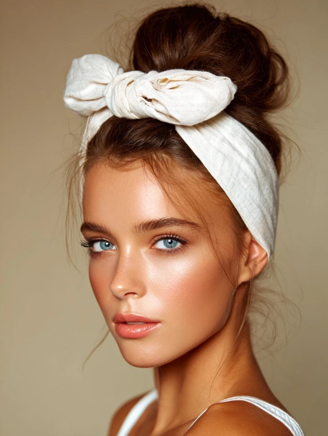 A high bun avoids helmet pressure points, and a warm headband keeps ears protected.