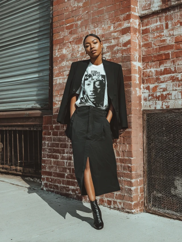 3. Black Midi Skirt + Graphic Tee + Blazer