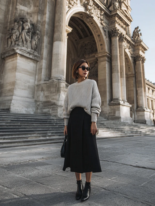 Styling a black midi skirt is all about balance — it pairs effortlessly with structured or relaxed tops.