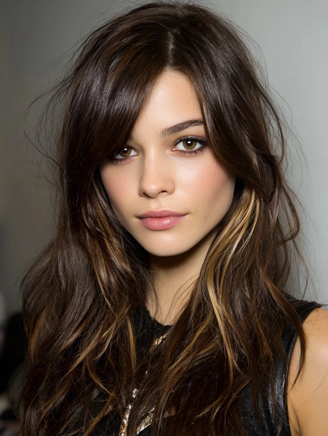 Lowlights give dimension to long caramel hair, preventing it from looking flat.