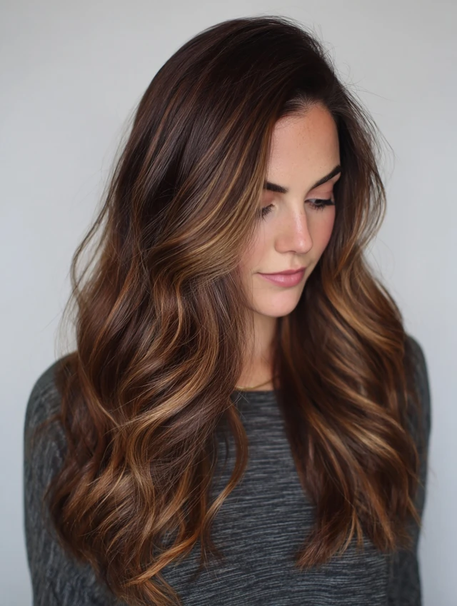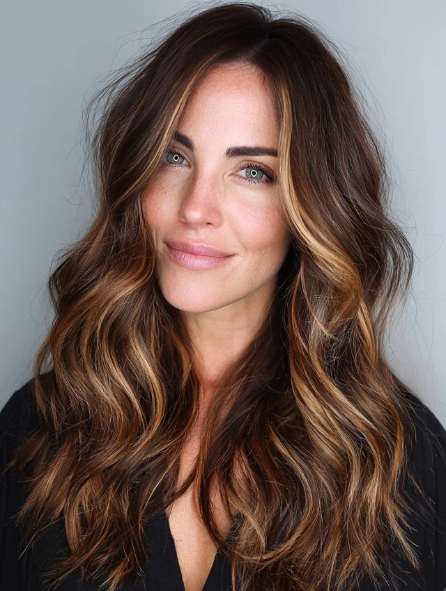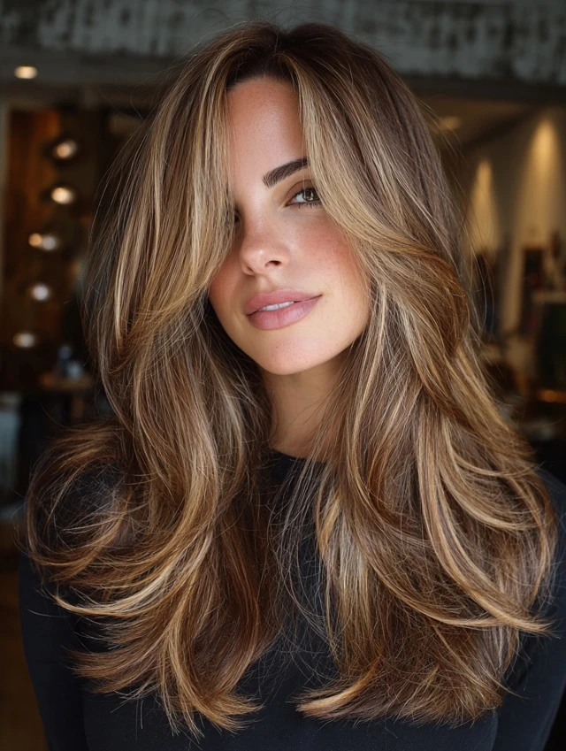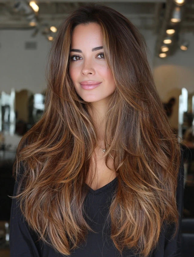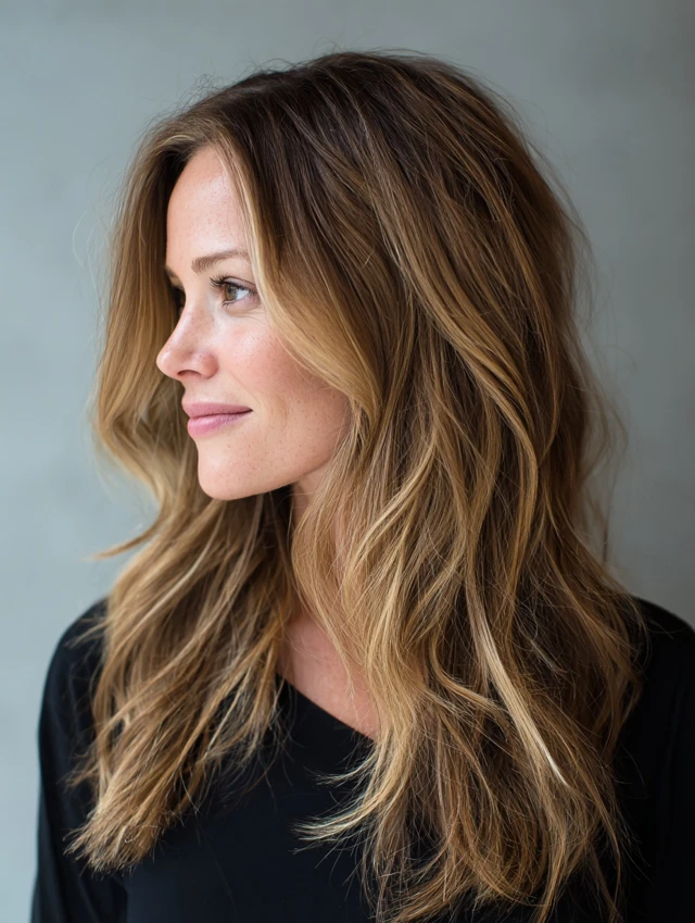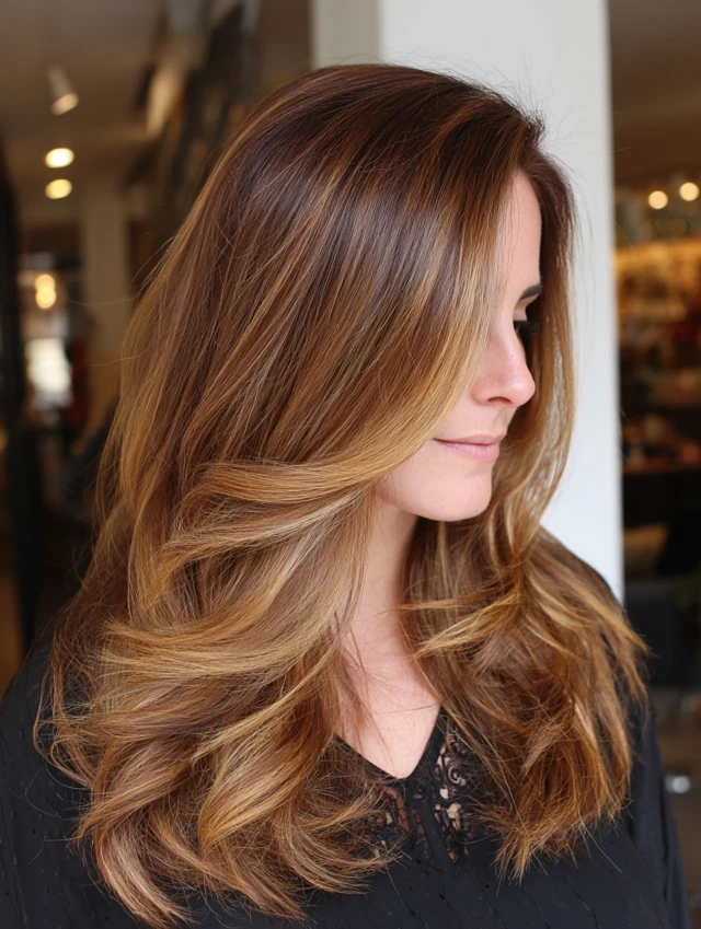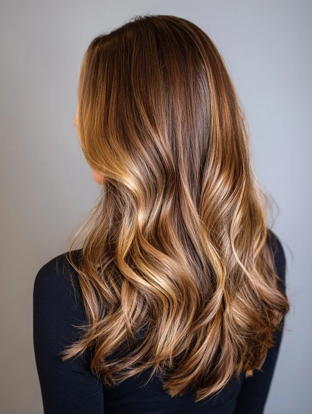 Long hair with caramel layers adds movement and depth without heavy styling.
