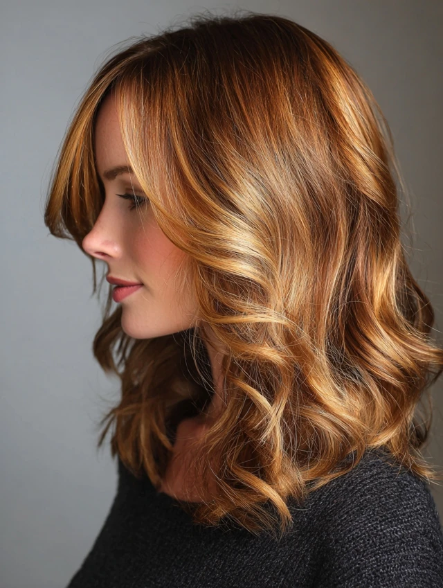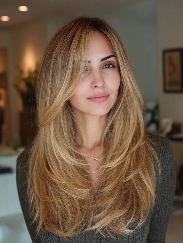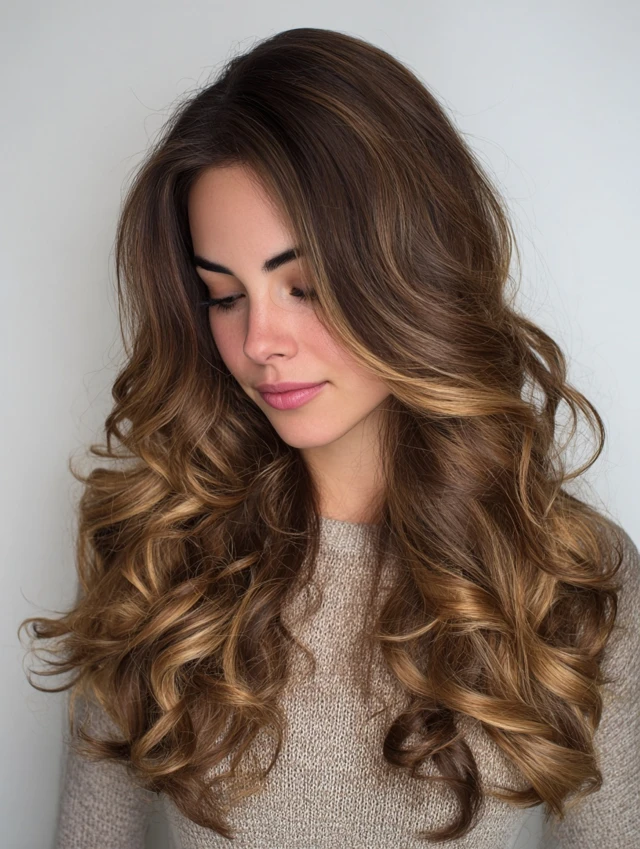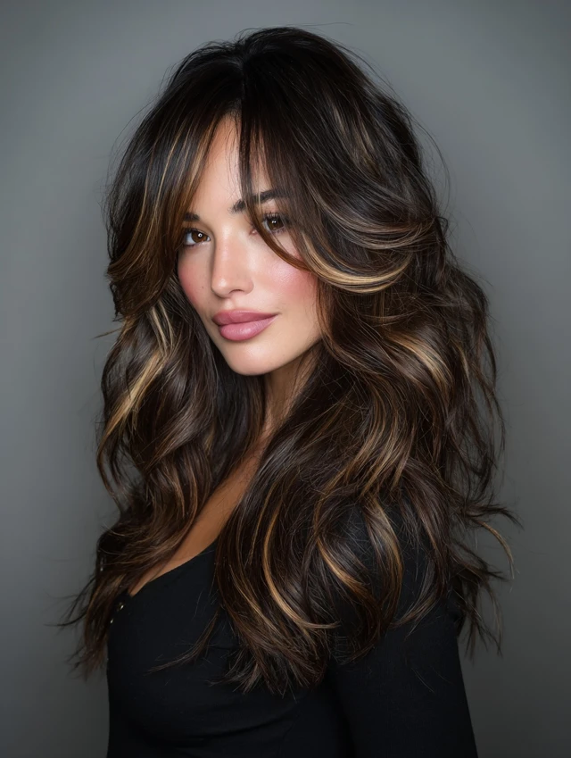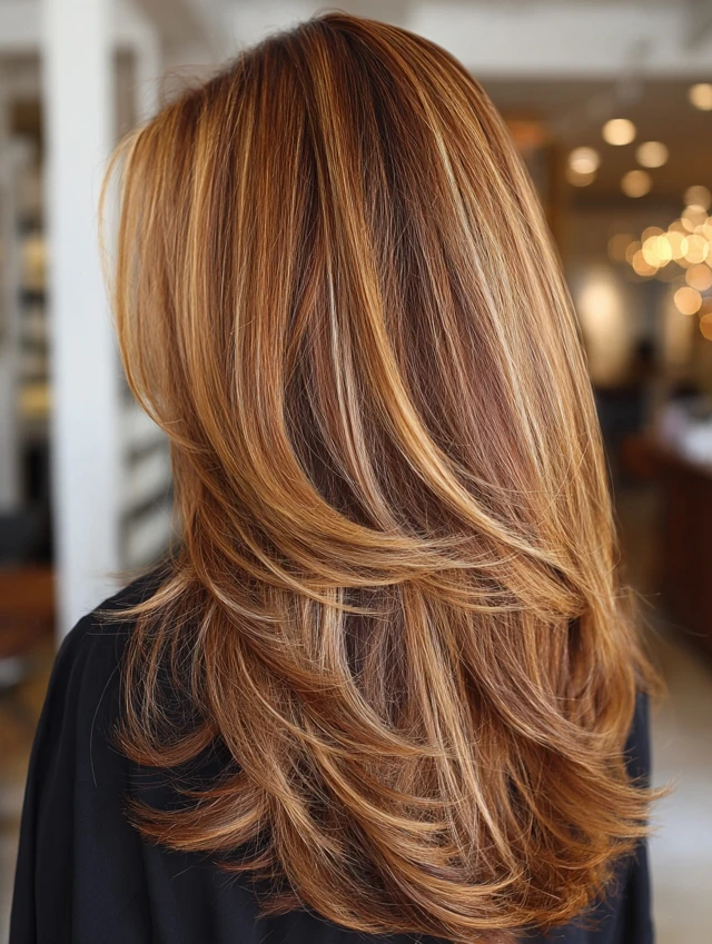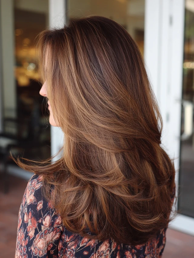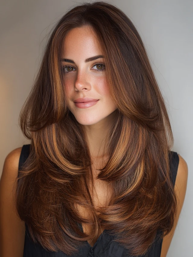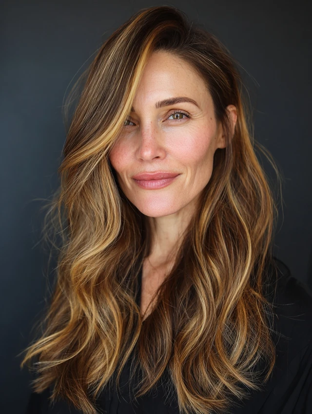 Long hair with caramel layers adds movement and depth without heavy styling.