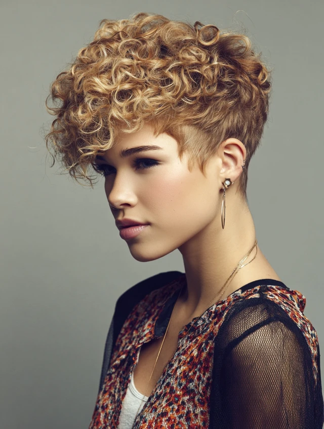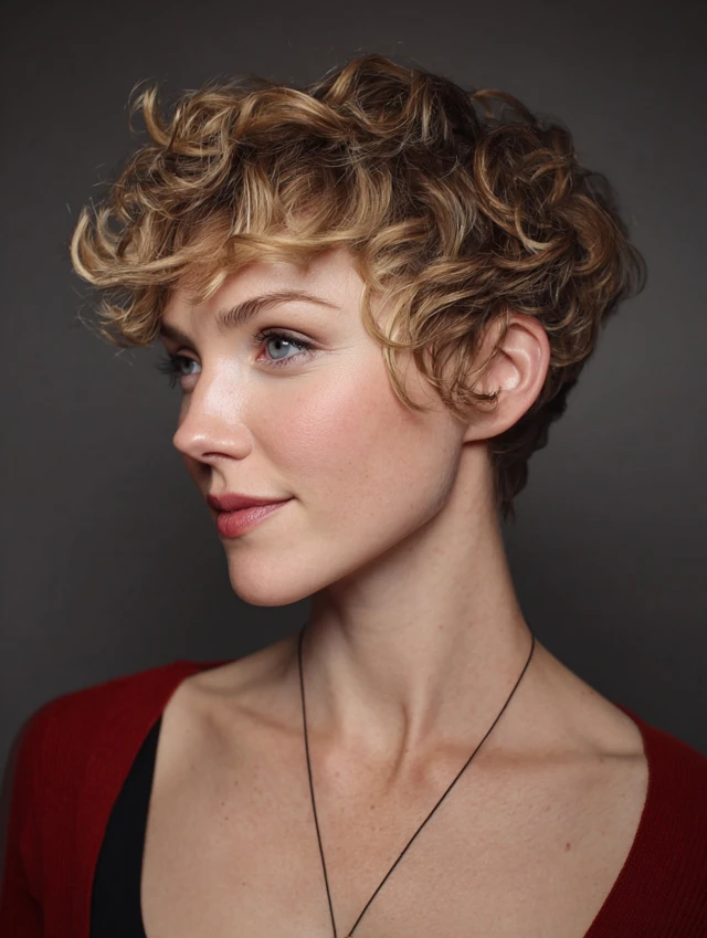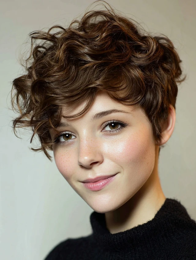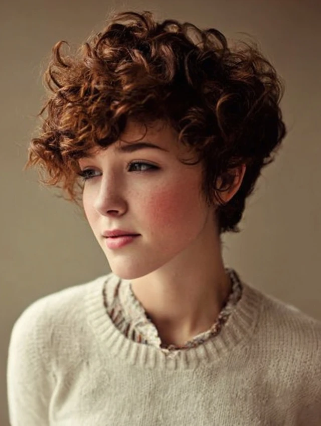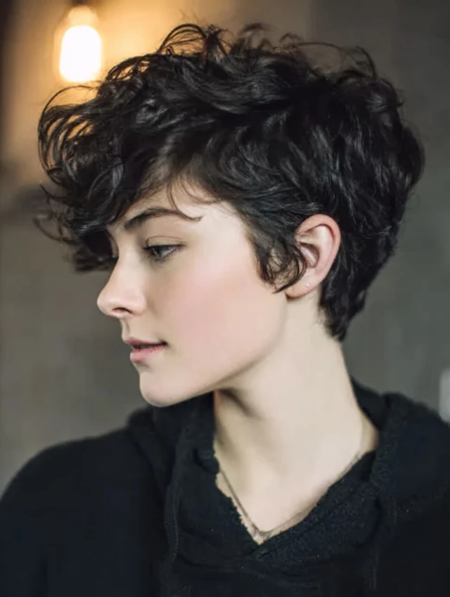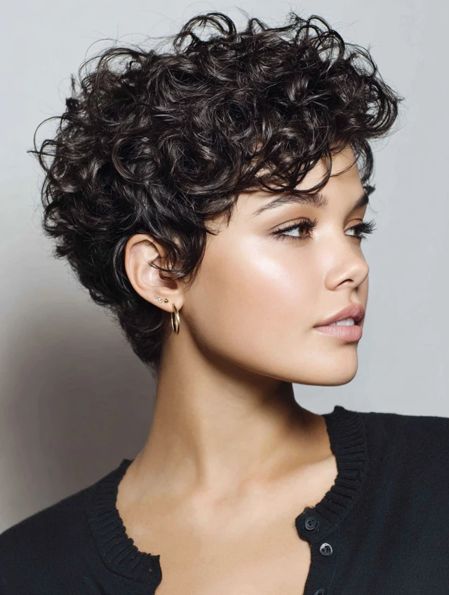 Classic curly pixie, layered pixie, tapered pixie, or side-swept pixie.