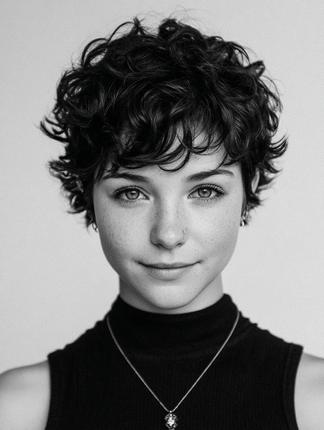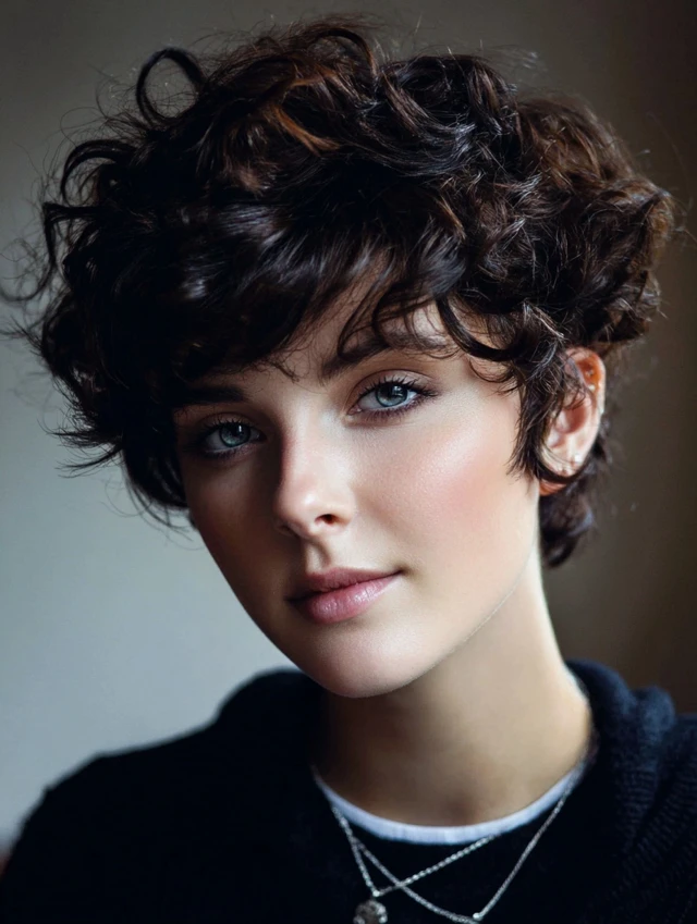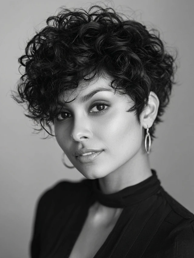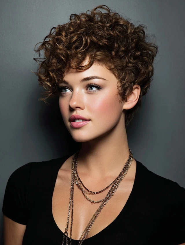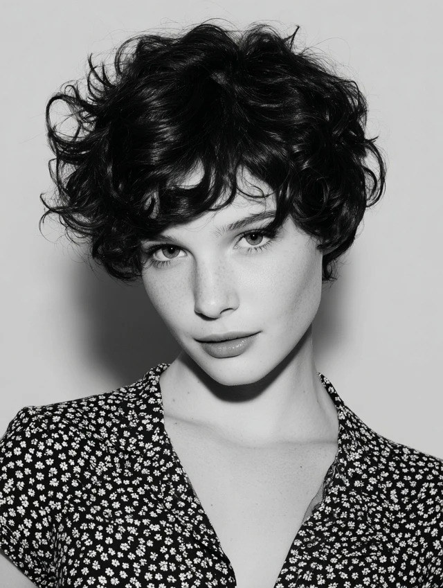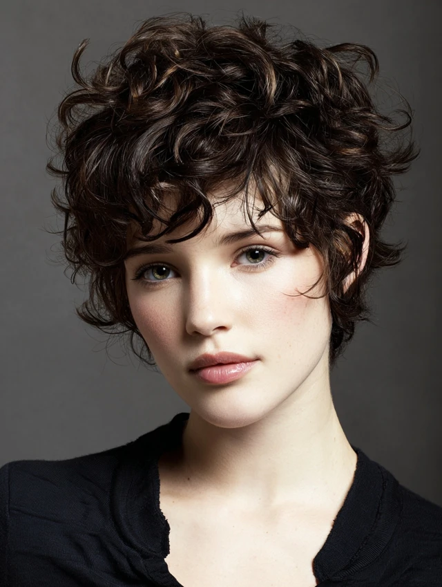 Classic curly pixie, layered pixie, tapered pixie, or side-swept pixie.