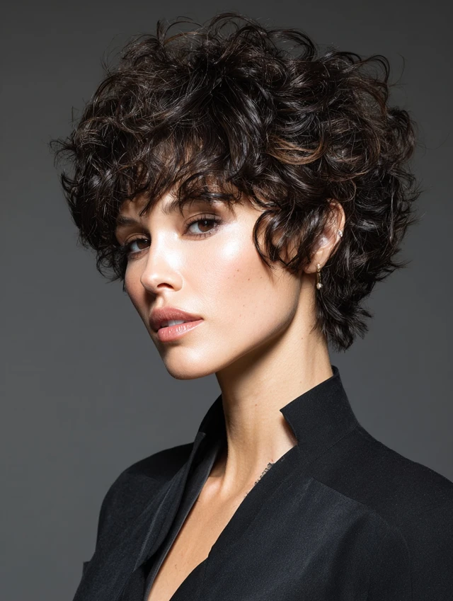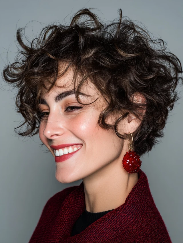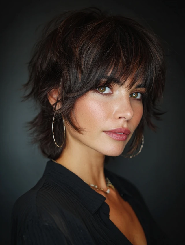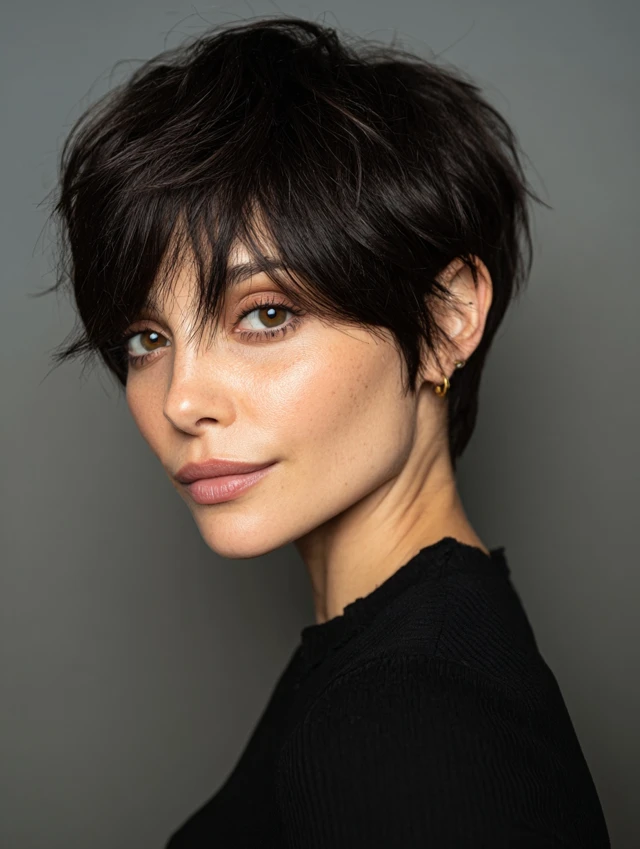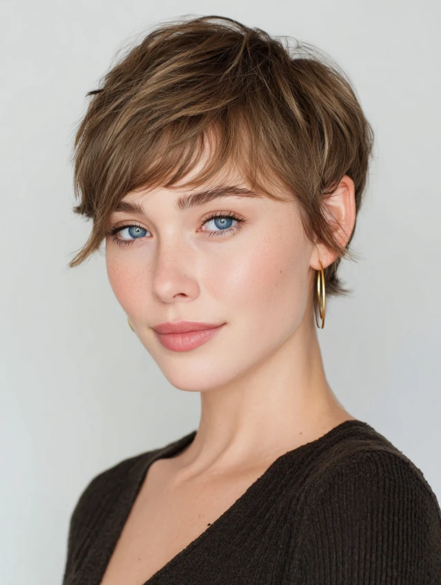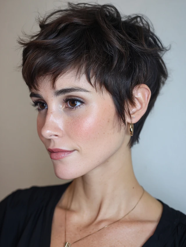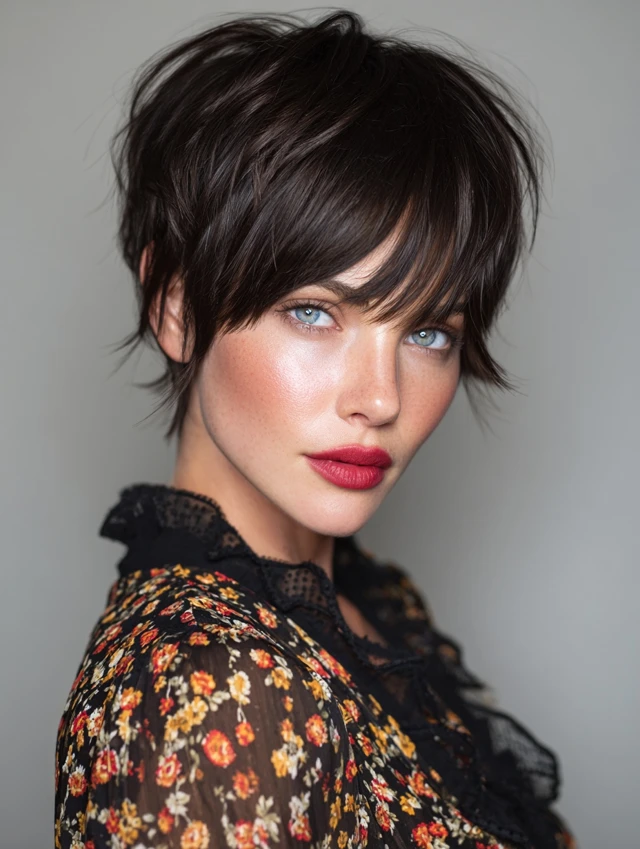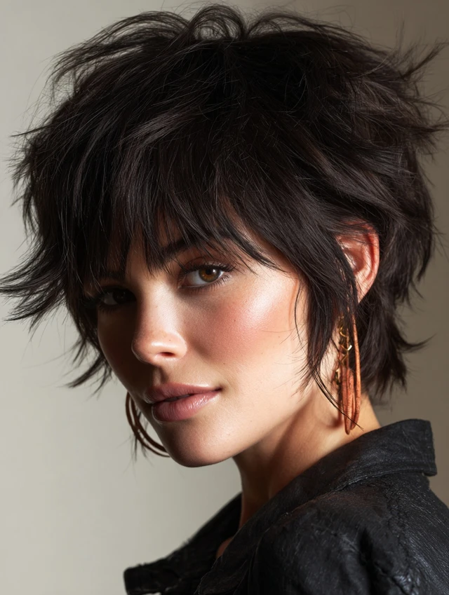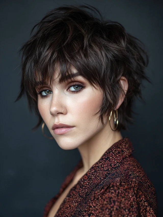 Layered pixie, bob, asymmetrical cut, or short shag with face-framing pieces.
