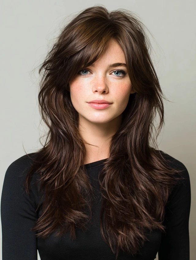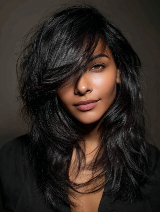 Side-swept bangs blend naturally with the deep part, framing the face beautifully.