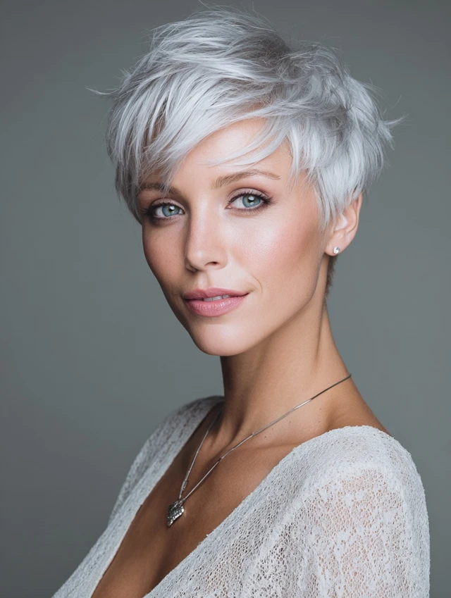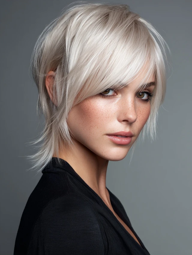 The icy platinum color enhances the layers and movement of a bixie cut, giving hair a luminous, dimensional finish that stands out.