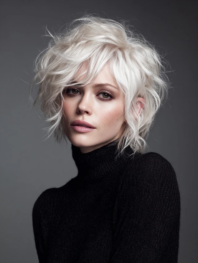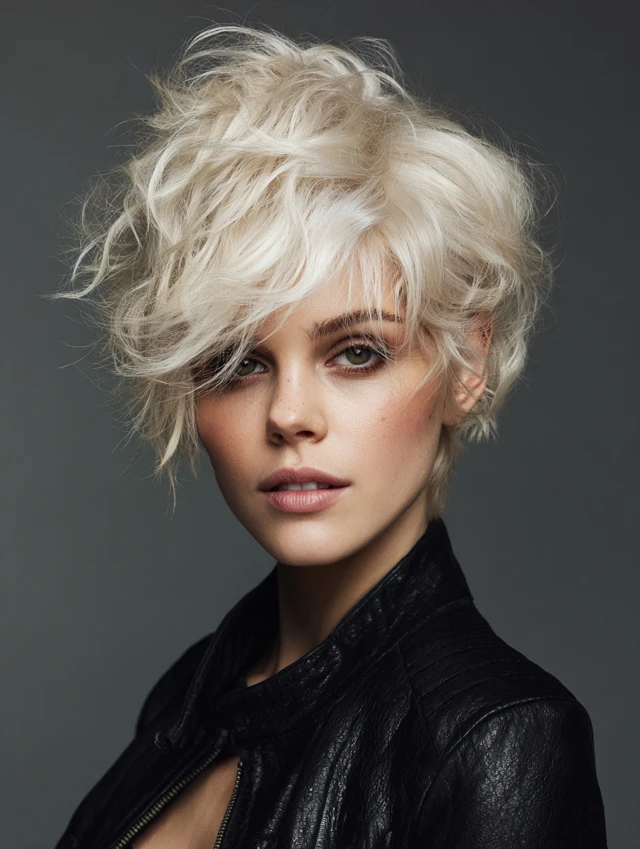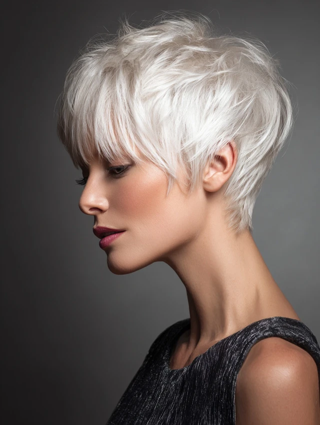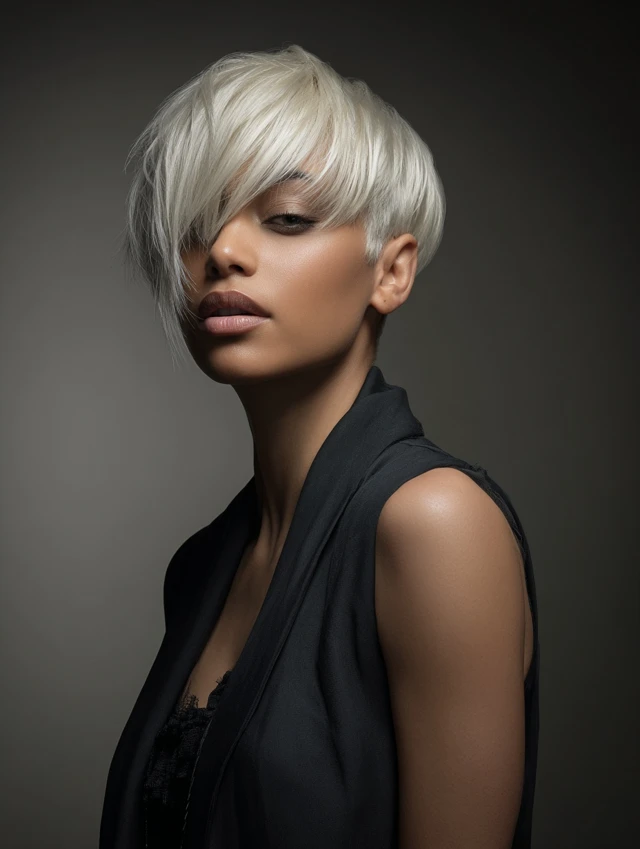 The platinum blonde bixie haircut is perfect for anyone wanting a short, edgy, and attention-grabbing look. Its layered texture, face-framing pieces, and icy hue combine to create a versatile style that can be worn sleek, tousled, wavy, or choppy.