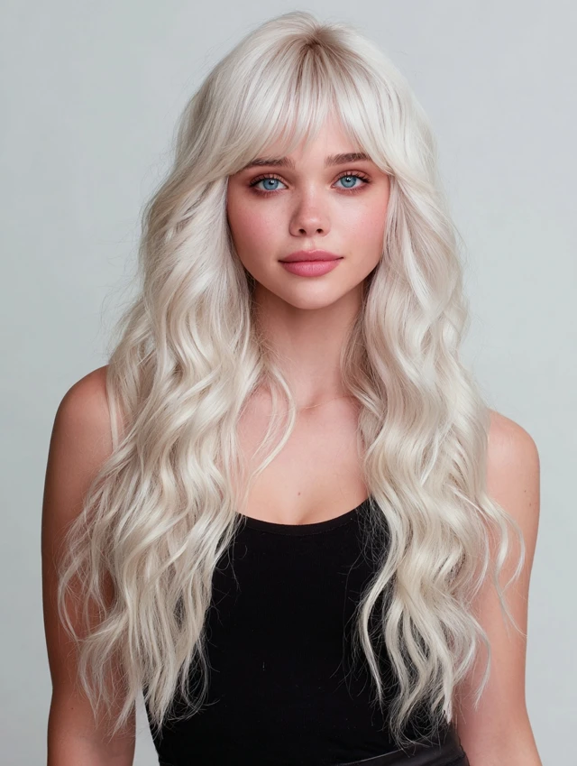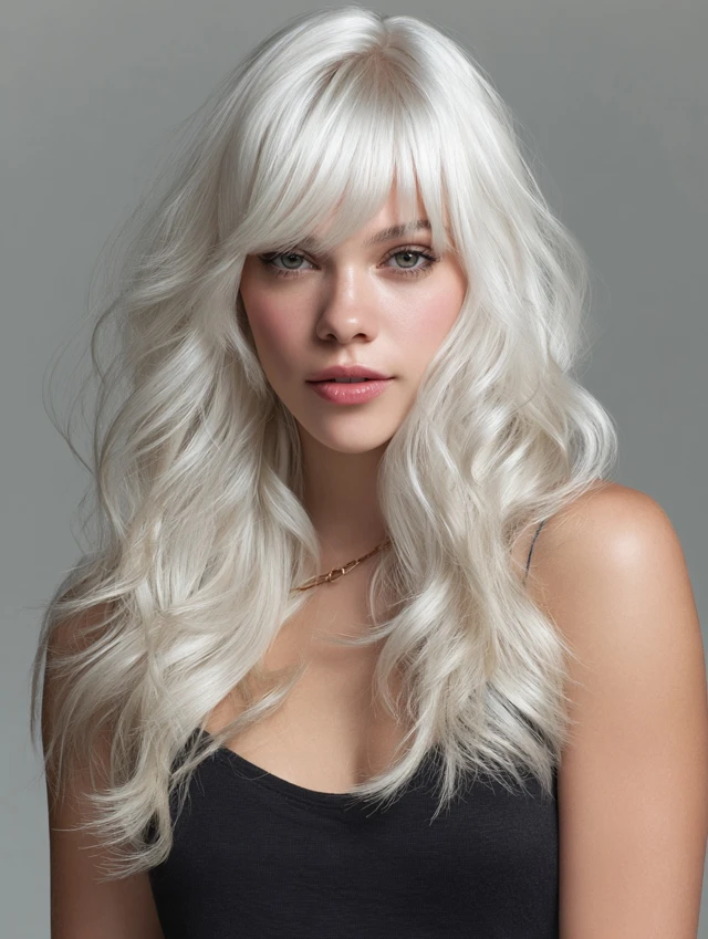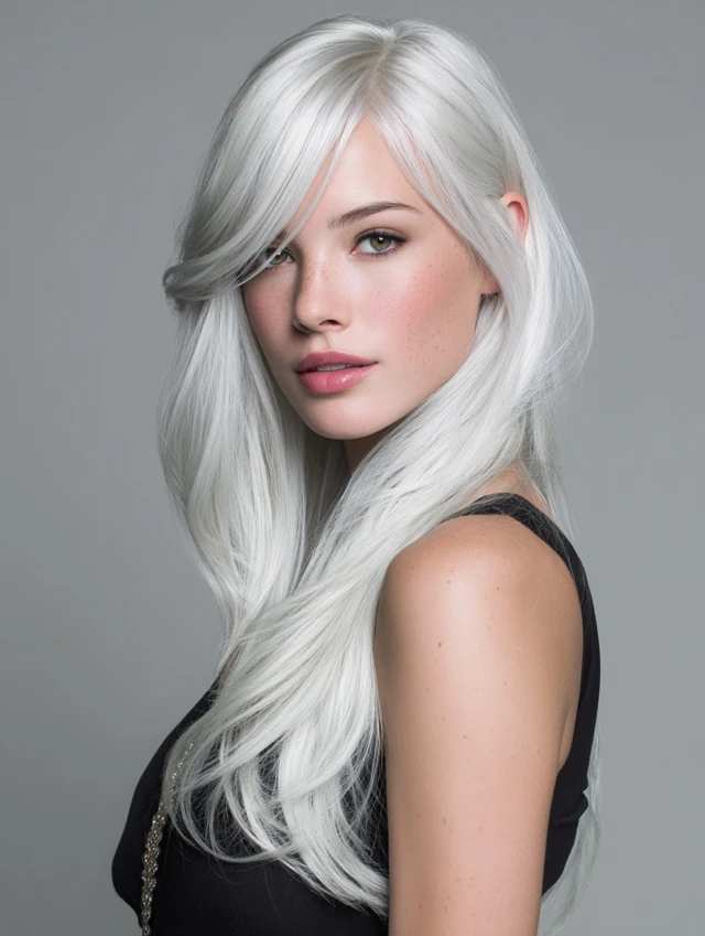 Side-swept layers frame the face and soften the platinum hue, adding dimension and charm.
