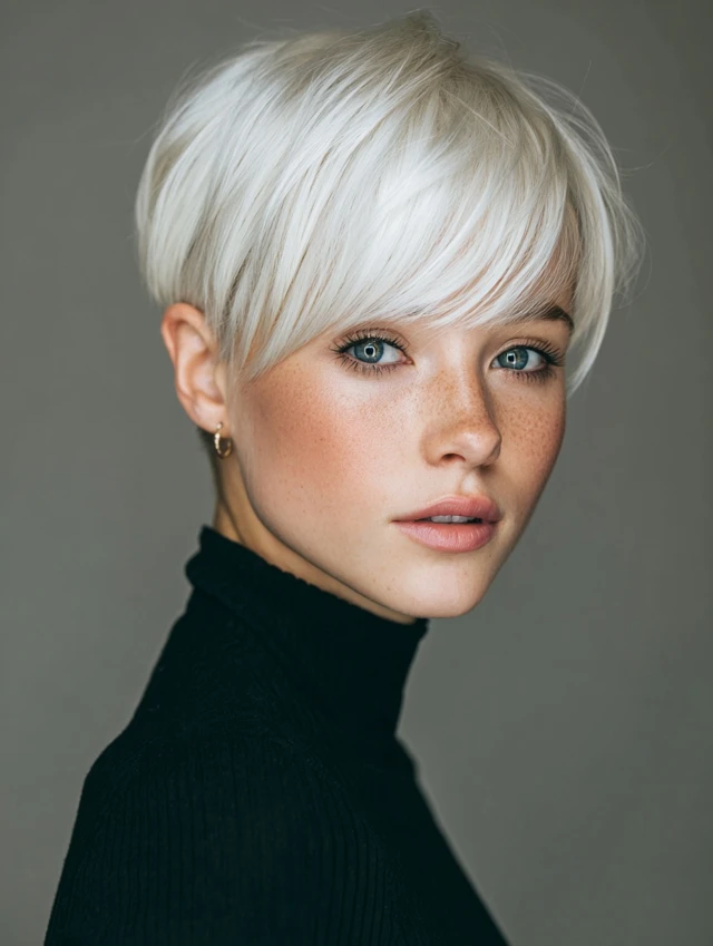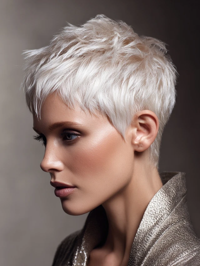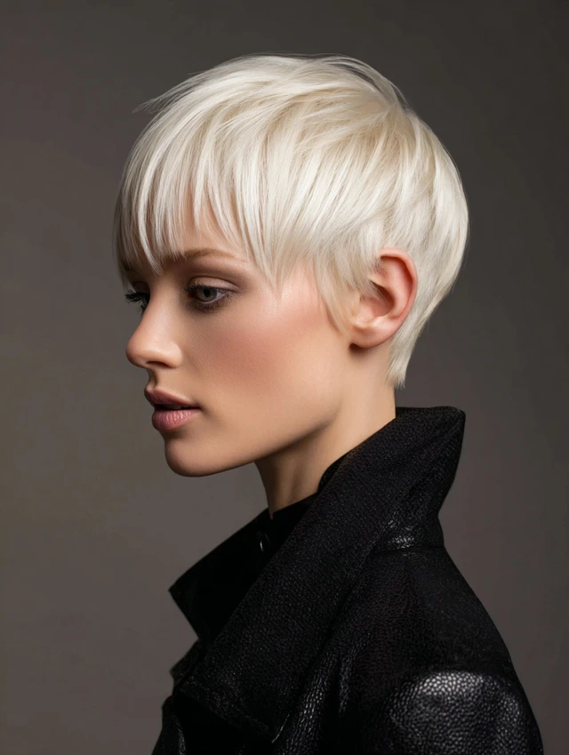 The platinum blonde bixie haircut is a striking take on the pixie-bob hybrid, combining edgy short layers with a bold, icy blonde hue. This style is perfect for anyone who wants a modern, eye-catching look that balances texture, volume, and effortless chic.