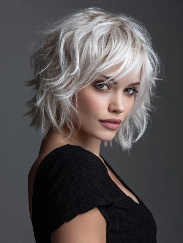 Choppy, layered texture adds depth and dimension, making platinum hair look dynamic and lively.