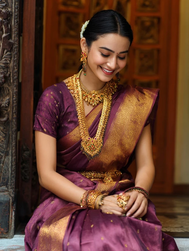 1. Classic Kanjeevaram Silk Saree + Temple Jewelry
