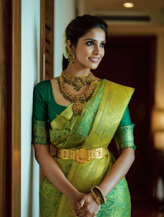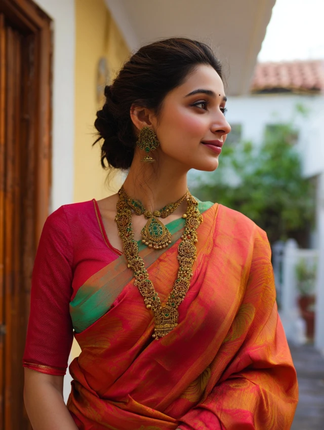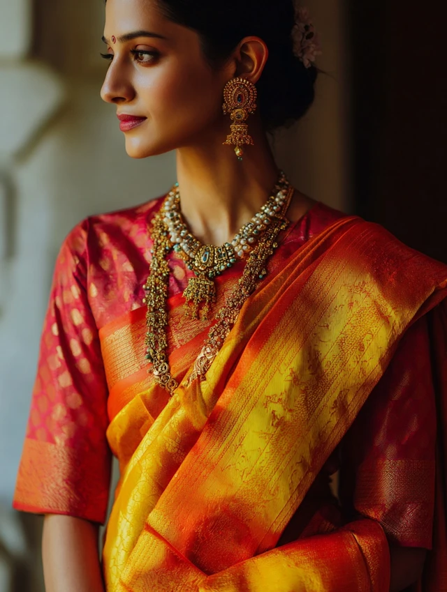 Why It Works: Nothing beats the grace of a traditional Kanjeevaram paired with gold jewelry for weddings or festivals.