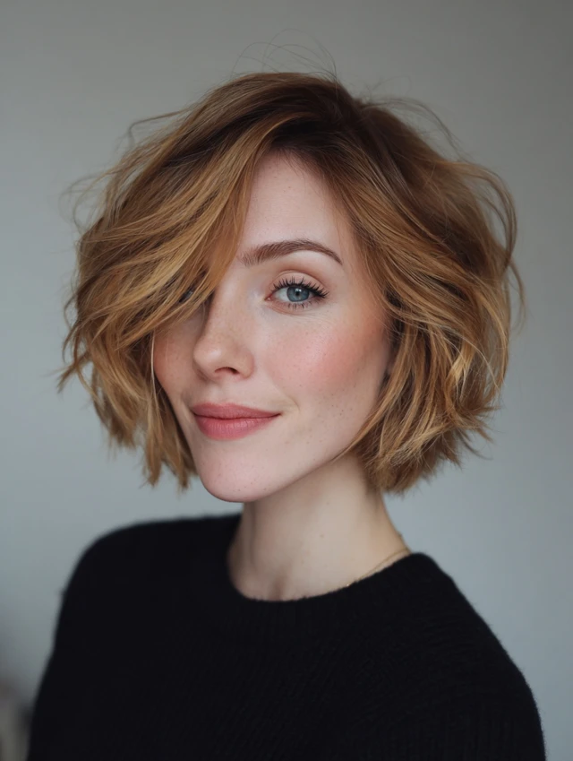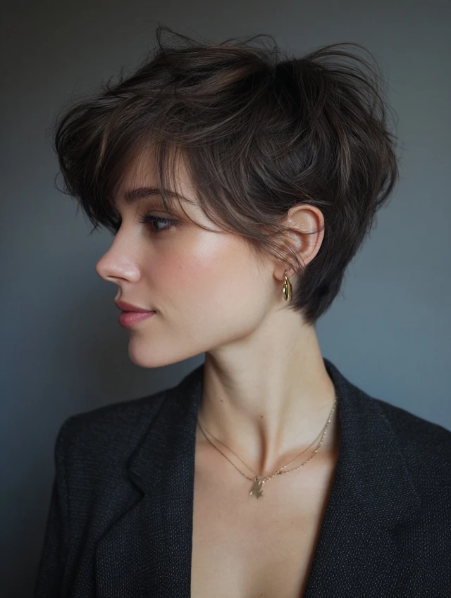 Short bob, pixie, or layered short styles.