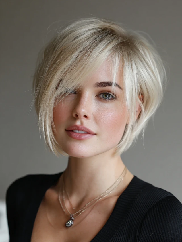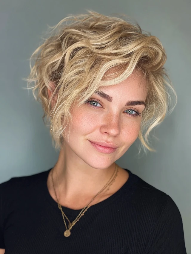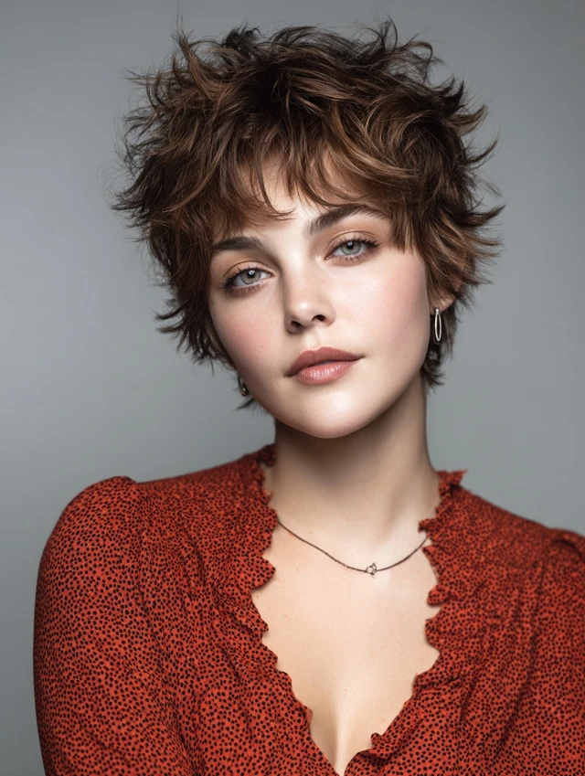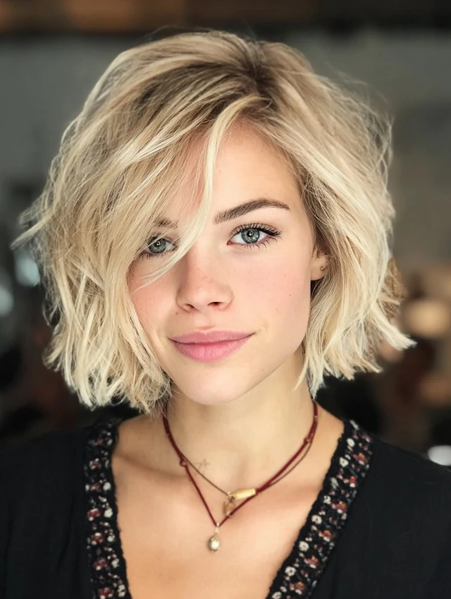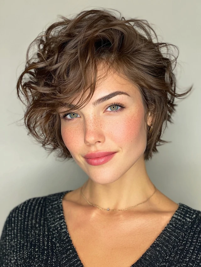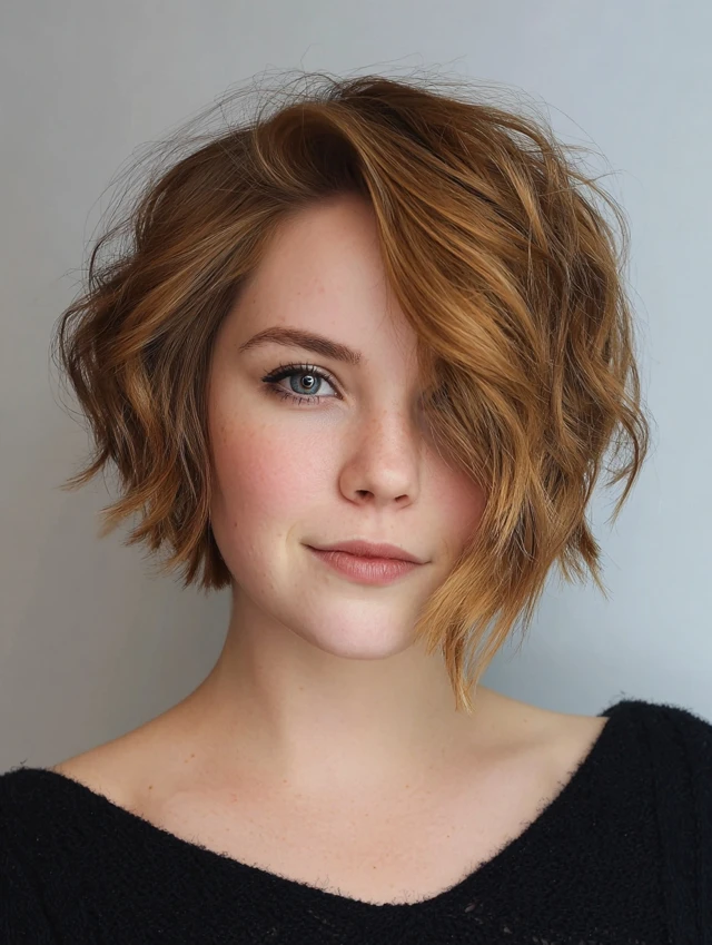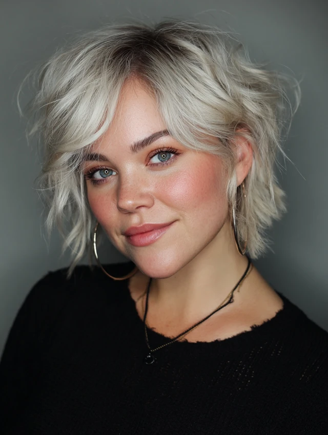 Layered bob, pixie with volume, asymmetrical bob, or textured shag.